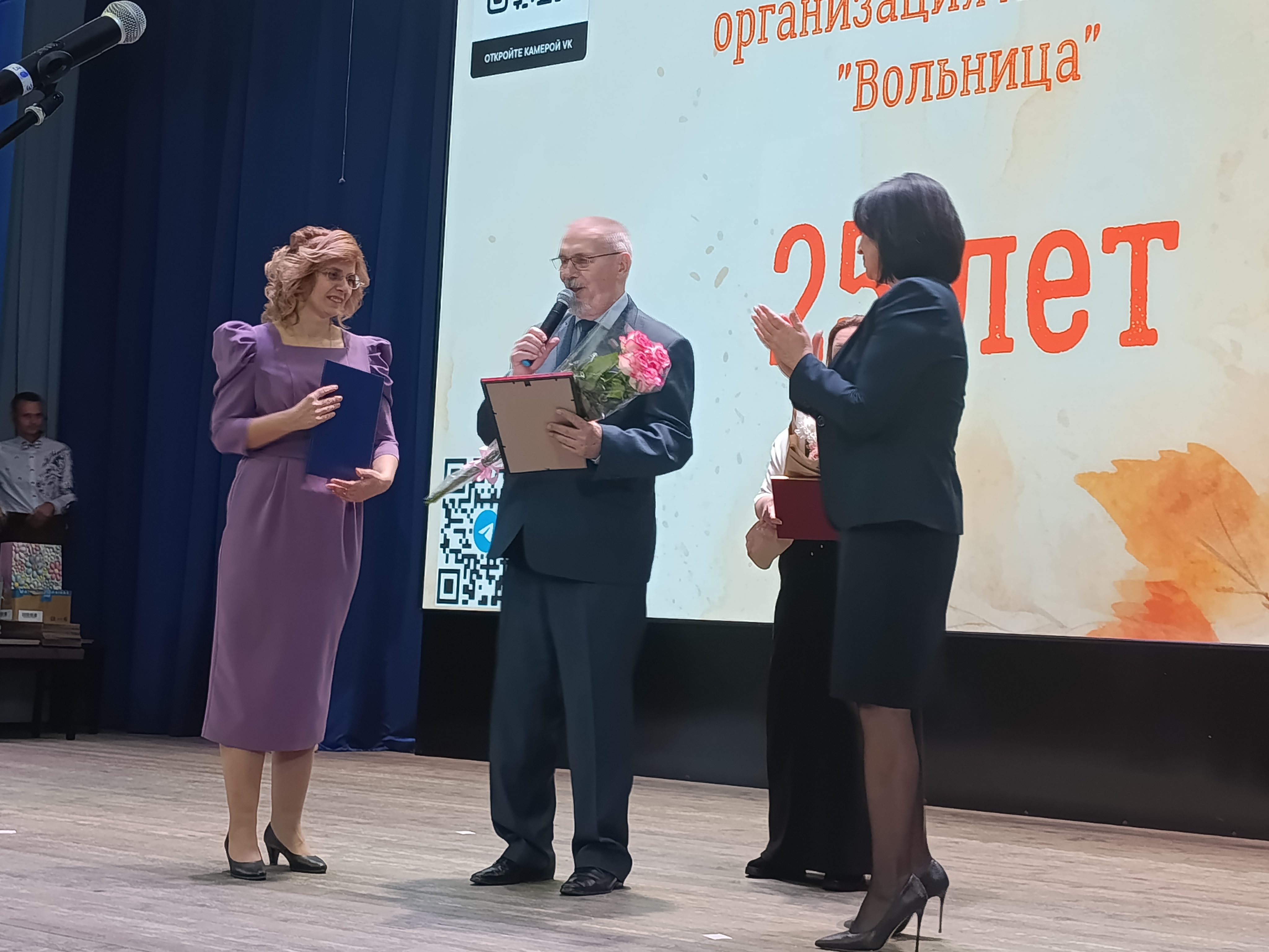 Со сцены Георгий Колягин поздравил «Вольницу» с юбилеем и обратился к председателю правления Анне Ковалевой: