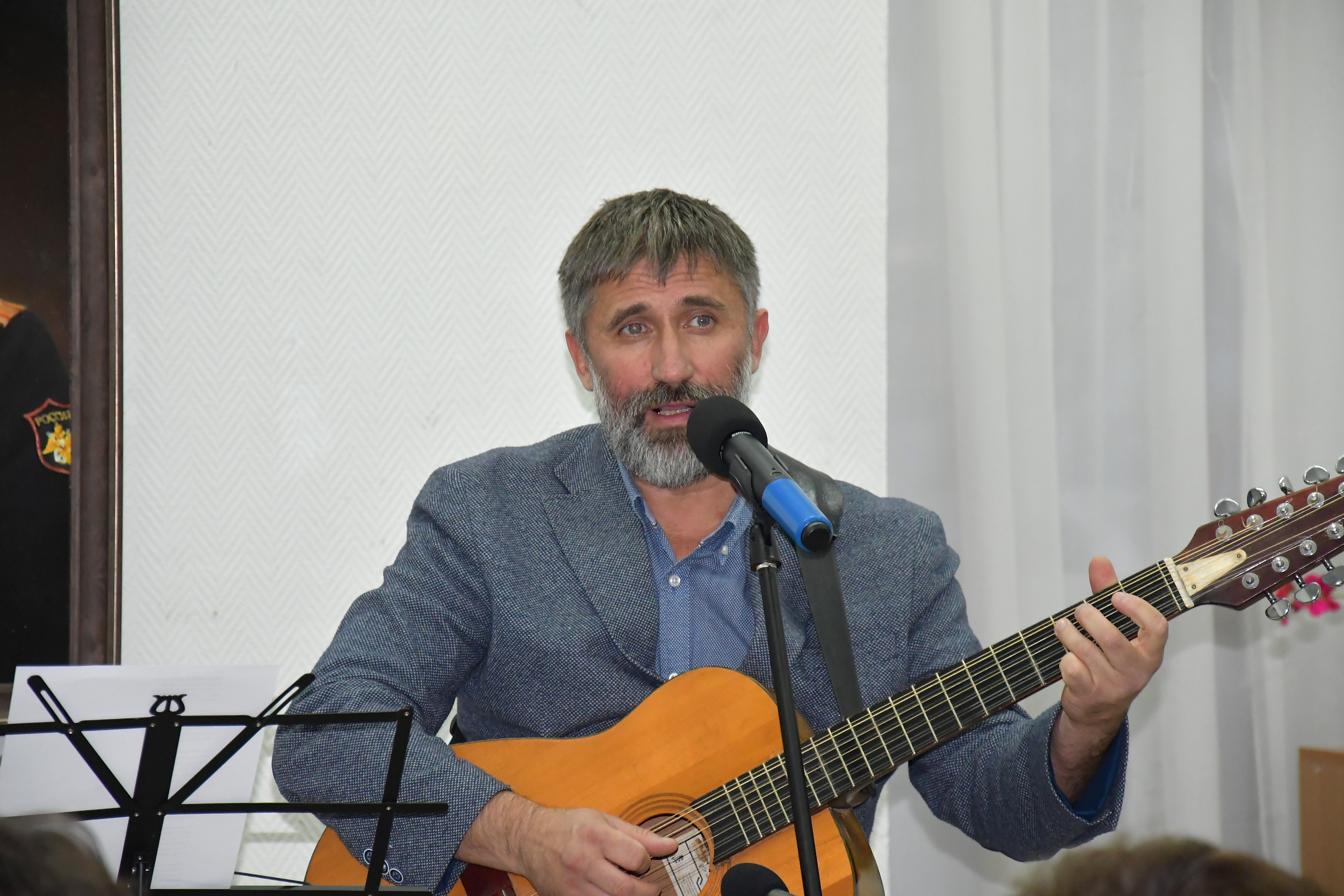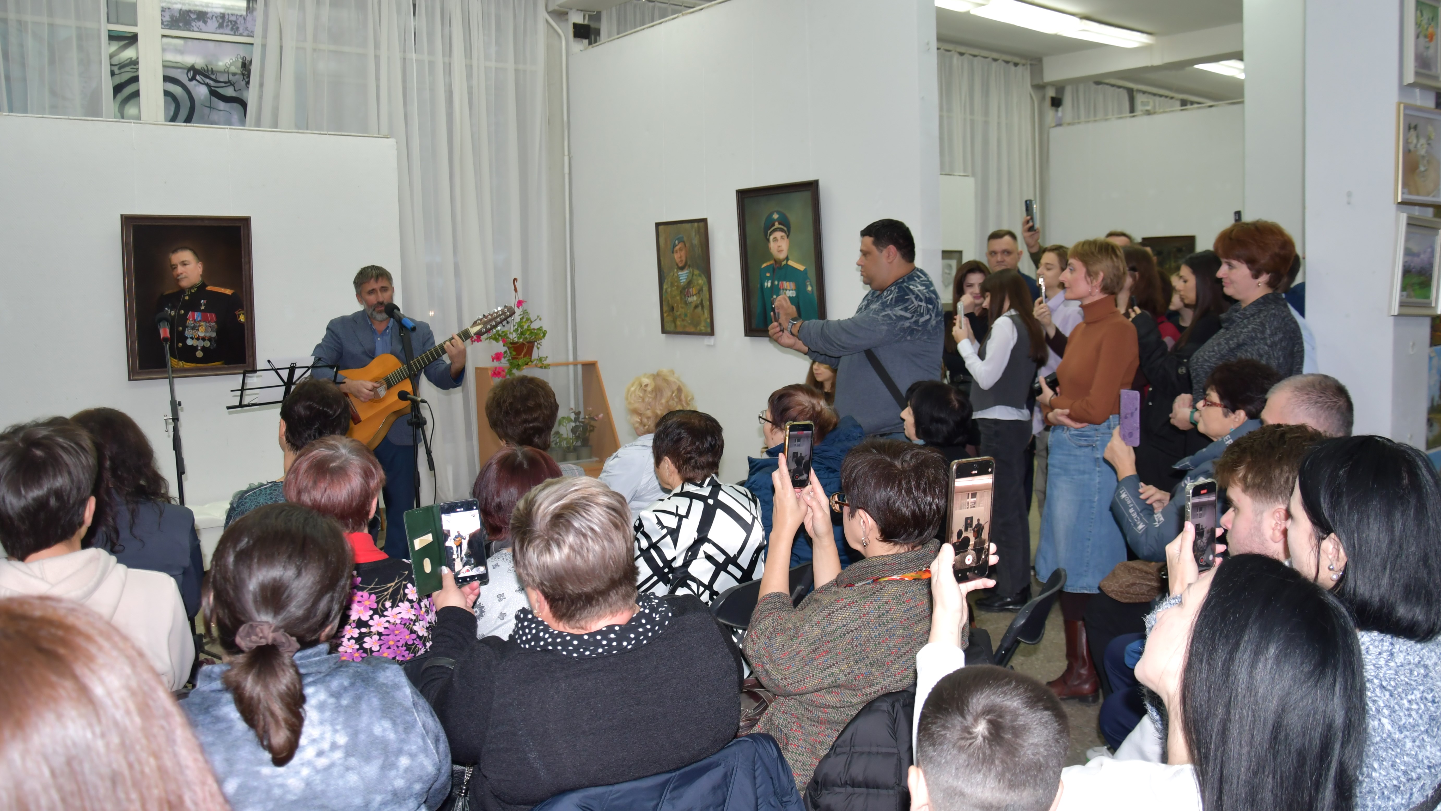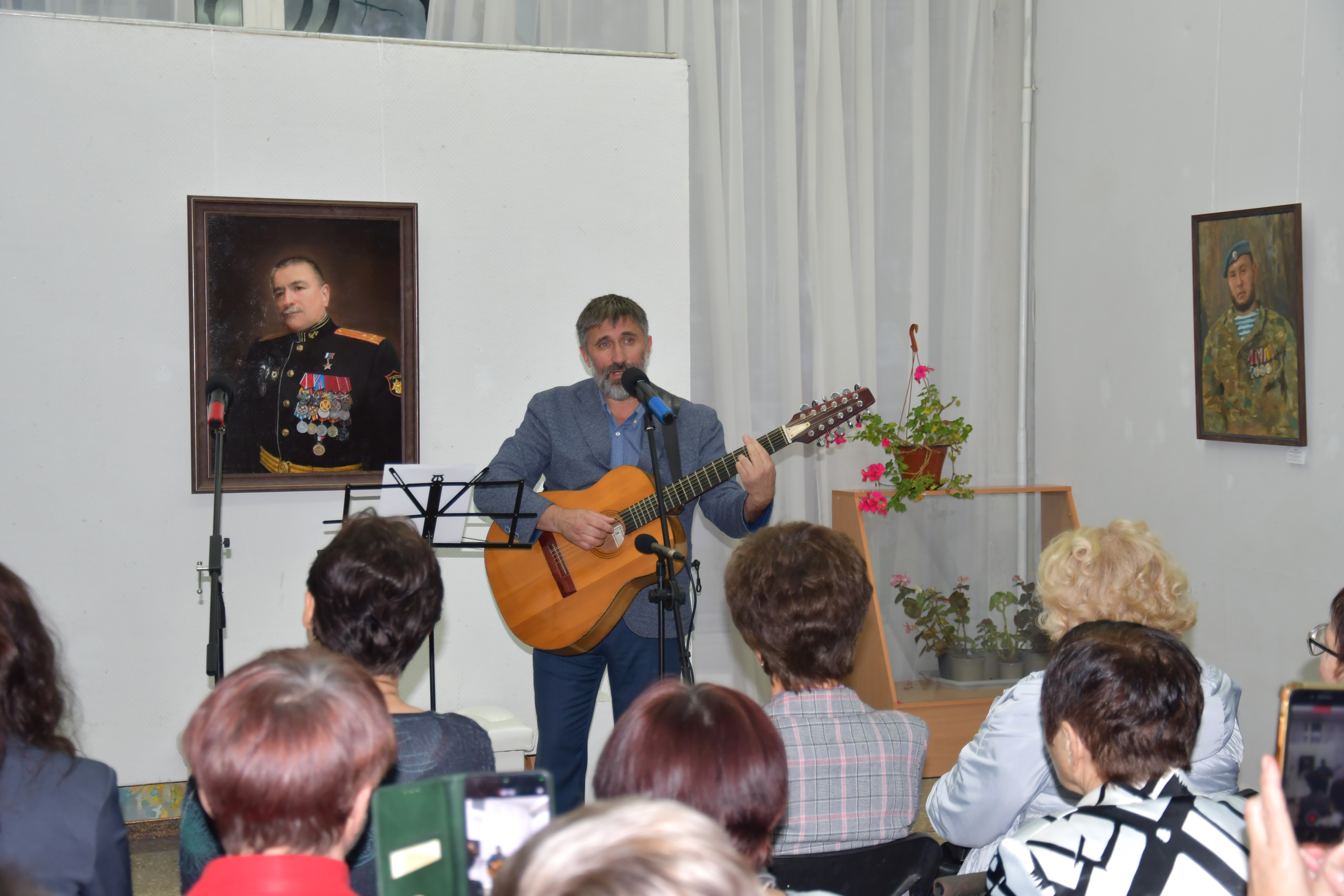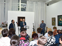 Эпиграфом к торжественной части мероприятия послужила песня, первая строчка которой дала название всей экспозиции. Исполнил лирическое произведение сам Александр Инячко, хорошо известный на Ставрополье как талантливый бард. На протяжении всего вечера его песни перемежались с приветственными выступлениями приглашенных лиц. Звуки душевных мелодий придали творческому вечеру особую теплоту и стали своеобразными, почти осязаемыми штрихами к портретам.