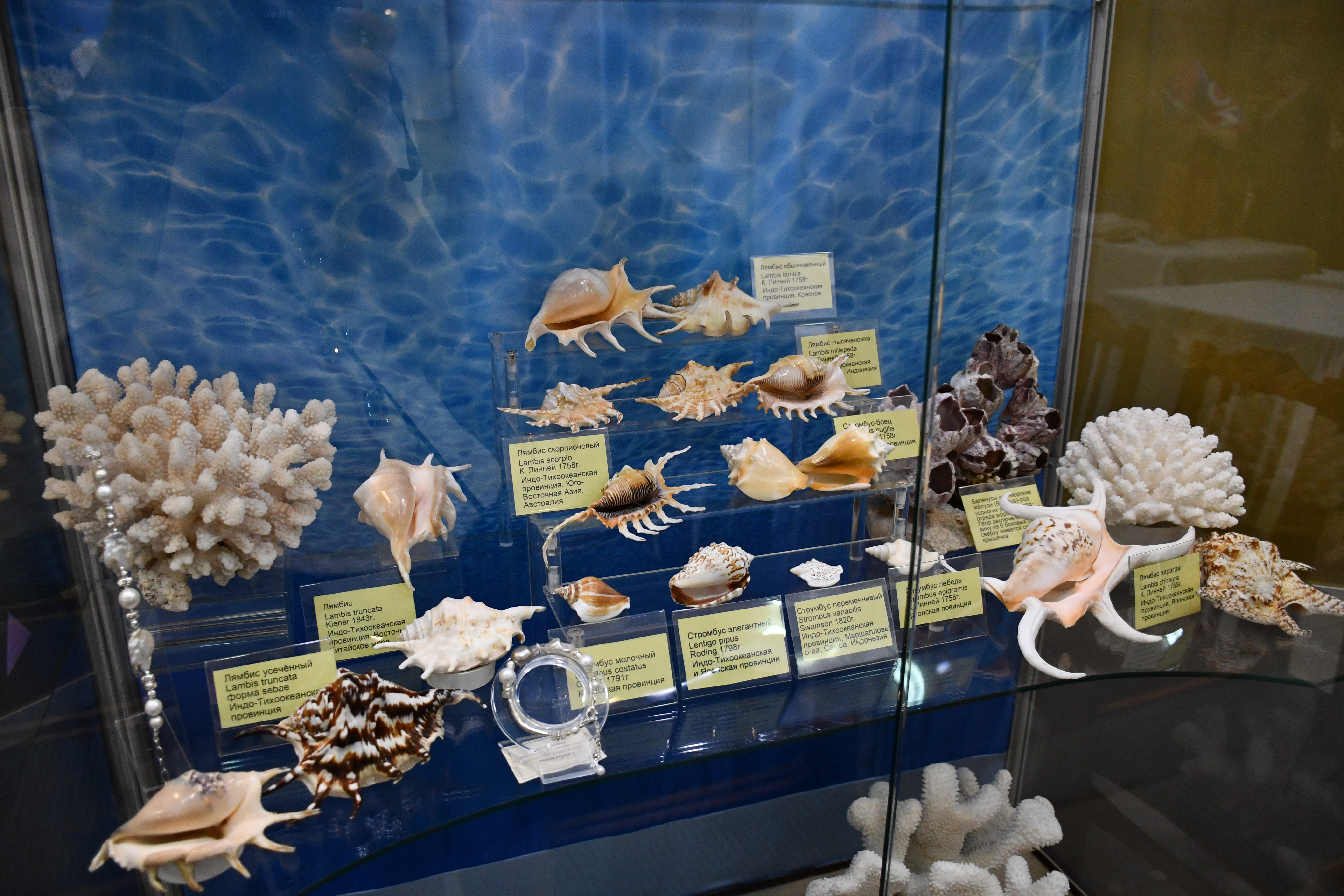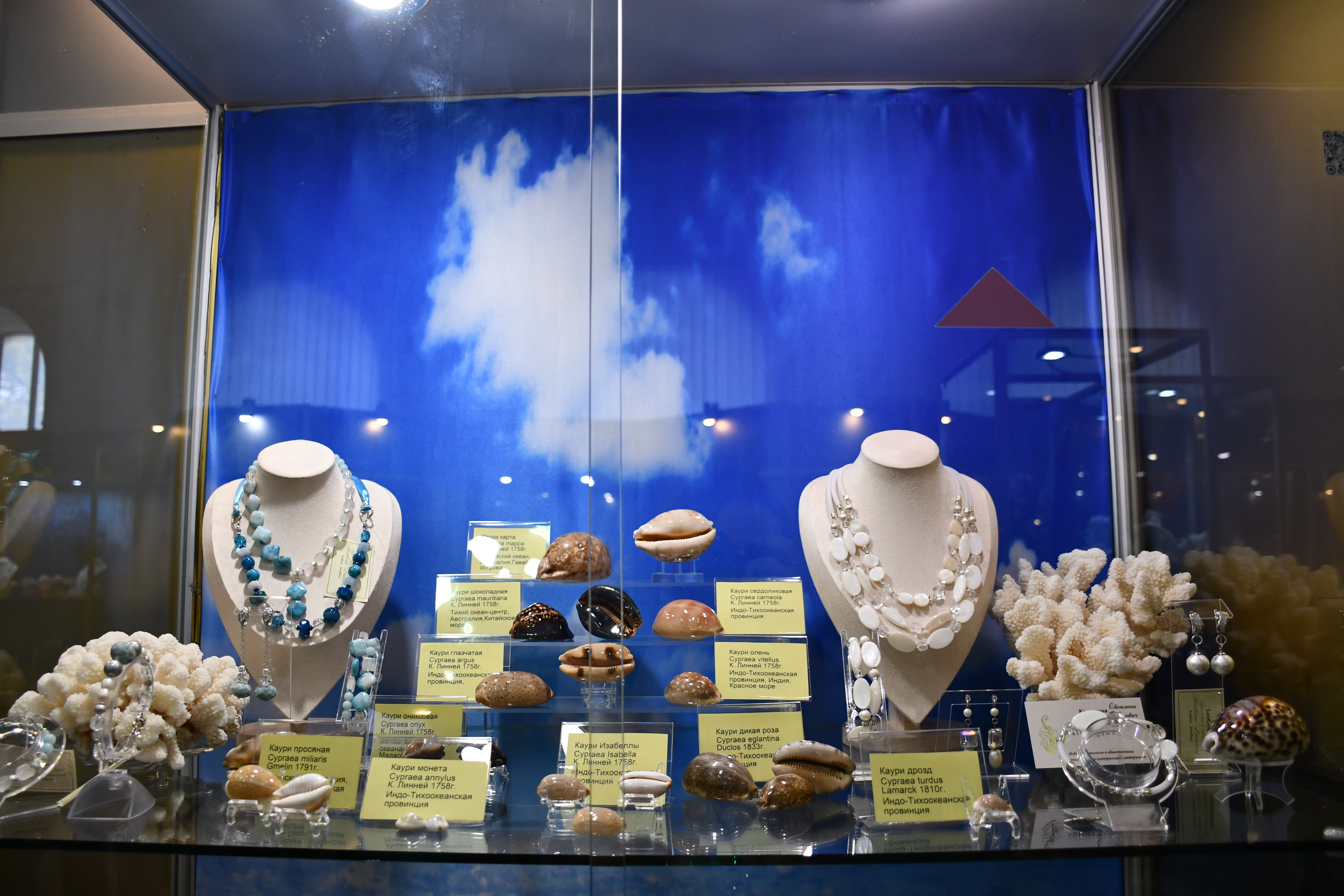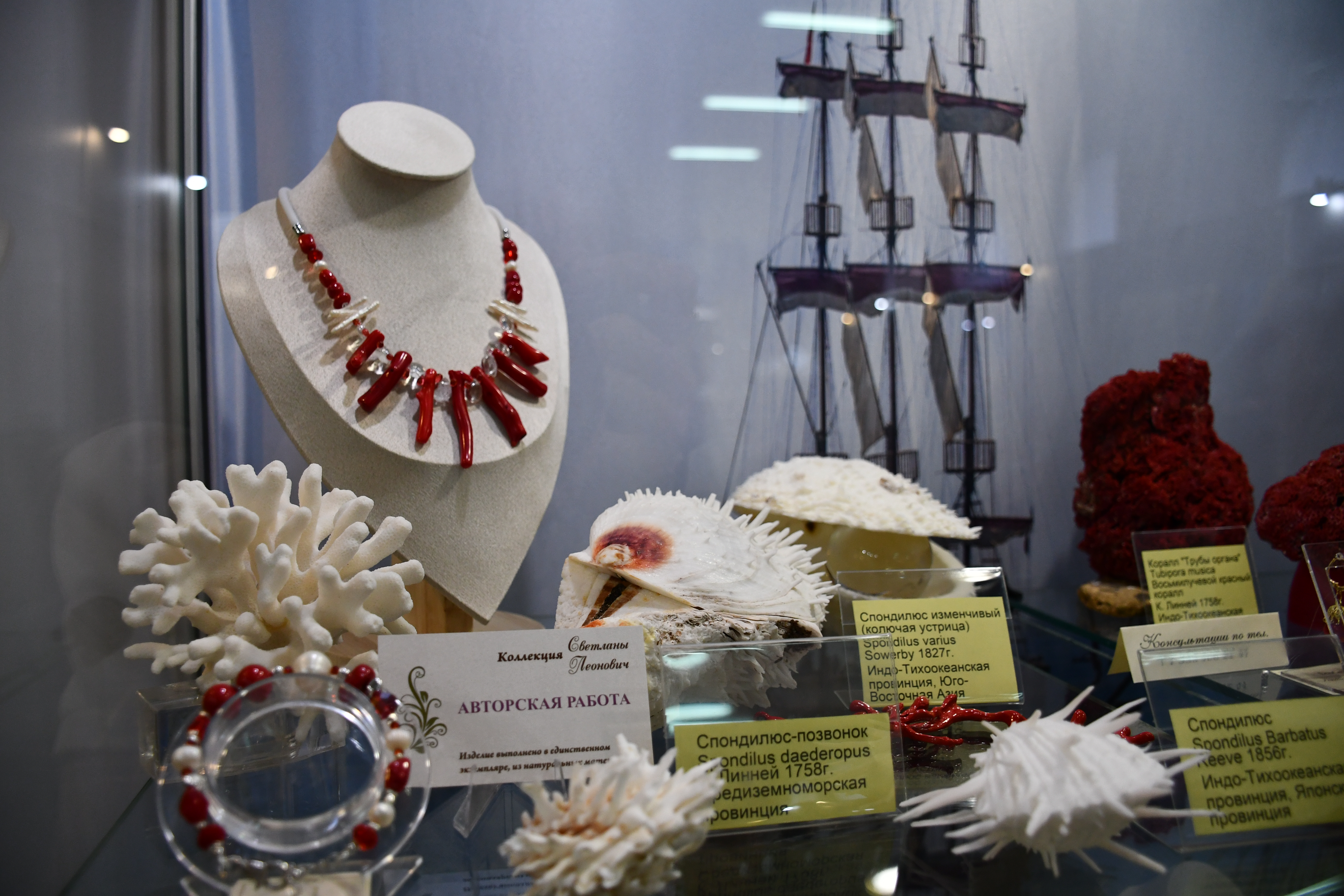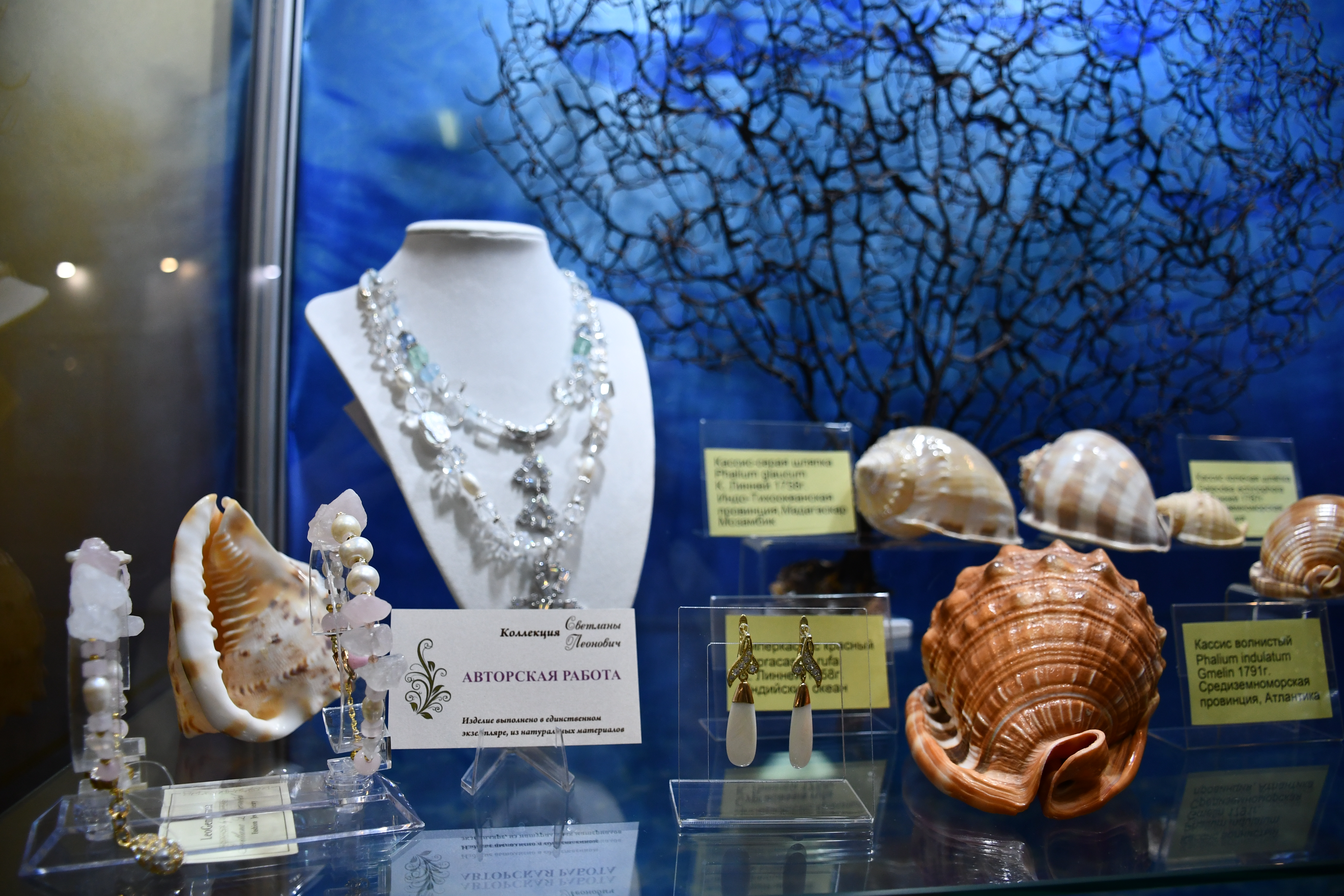 На выставке представлены оригинальные авторские украшения из коллекции «Литораль», а также уникальное собрание конхиологических редкостей, насчитывающее около 500 экземпляров. Это раковины моллюсков, кораллы-акропоры, природные окаменелости и конкреции провинций Мирового океана. Среди уникальных образцов собрания – золотая каури, настоящая жемчужница, североавстралийский трубач и многие другие редкие экземпляры.