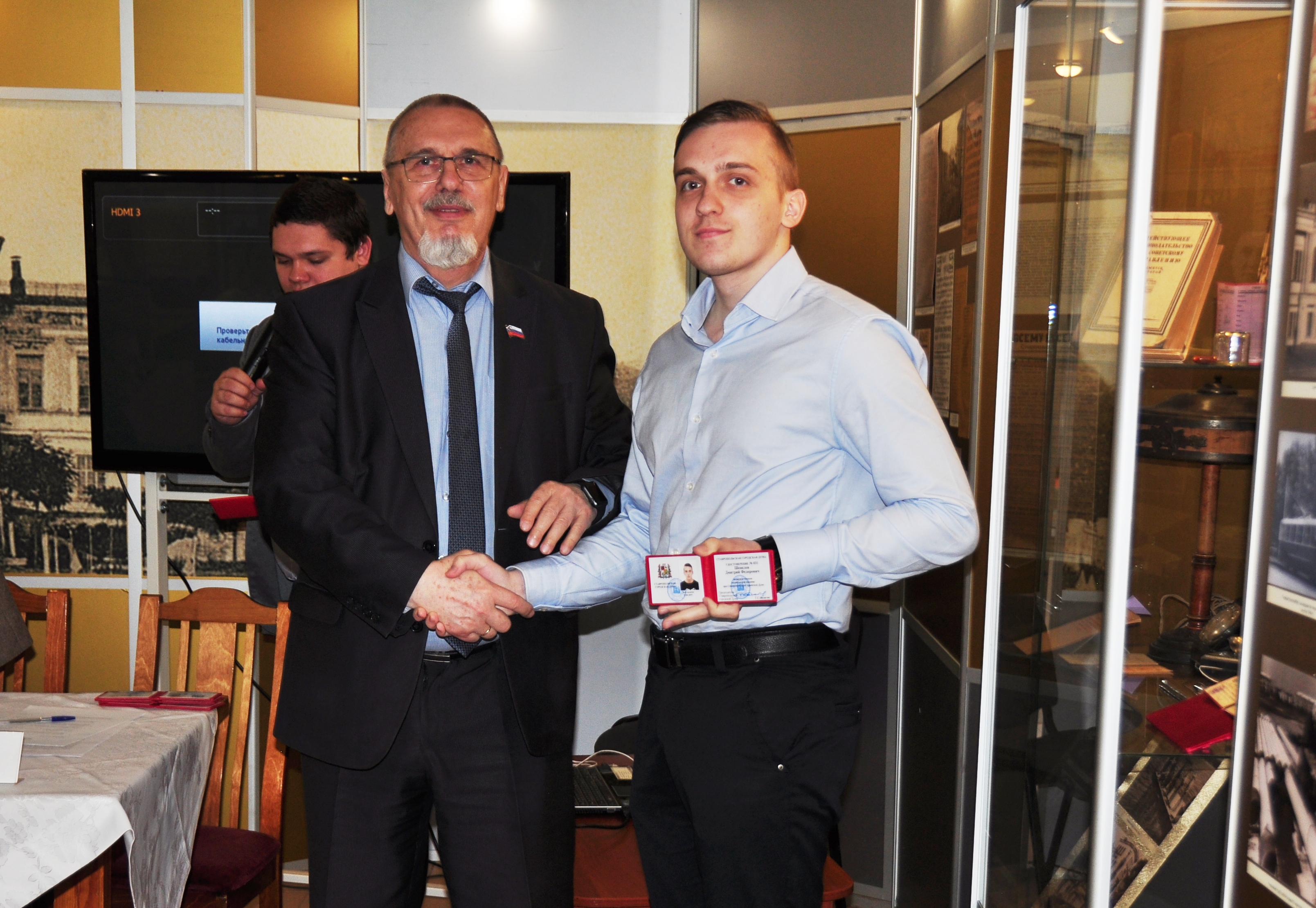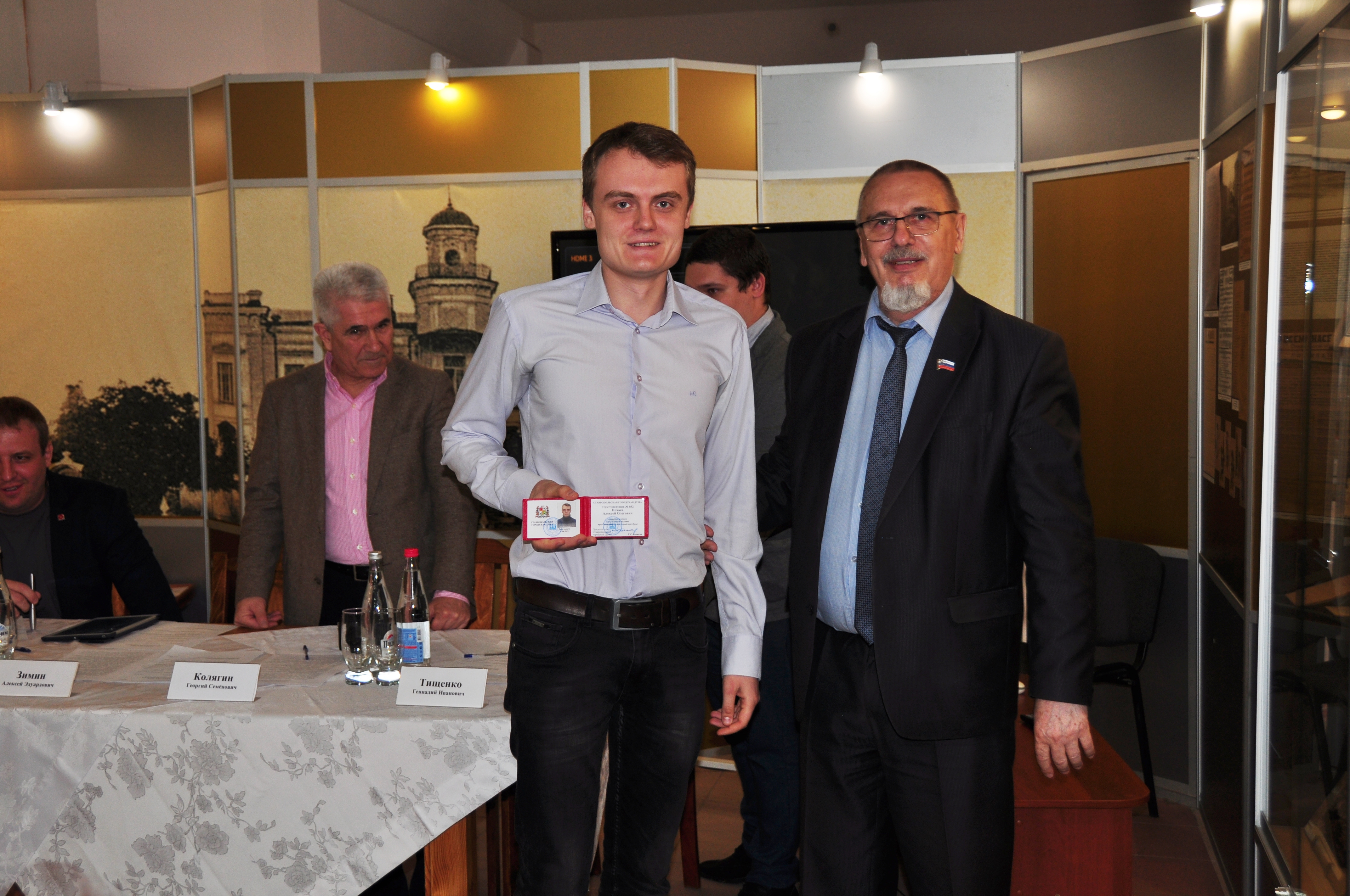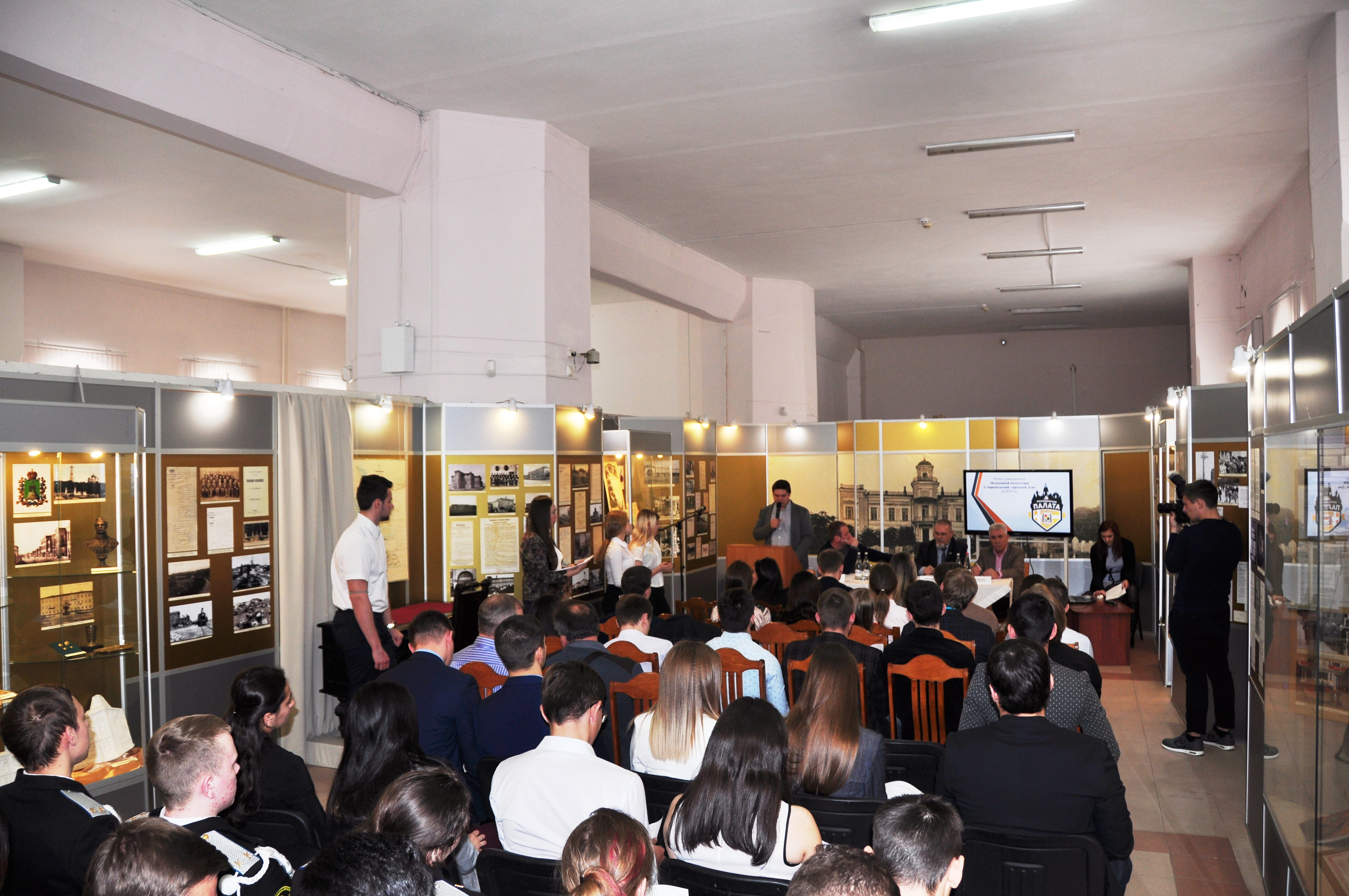 Вслед за депутатами выставку посетили их младшие коллеги – члены Молодёжной палаты при Ставропольской городской Думе. В стенах музея, пропитанных историей представительного органа, состоялось торжественное заседание палаты. В её ряды были приняты новые члены, удостоверения которым вручил сам спикер «большой» Думы Георгий Колягин, после чего председатель молодёжного парламента отчитался о деятельности палаты за 2018 год. Как оказалось, юные ставропольцы весьма активны: регулярно организуют патриотические, спортивные и экологические акции. Не обошлось без награждений, палата провела массу мероприятий, приуроченных к 25-летию Думы. Юные горожане состязались в уме, смекалке и силе. Грамоты и кубки получали за призовые места в турнирах по шахматам, рукопашному бою, пейнтболу, бильярду и интеллектуальной викторине. От старших коллег прозвучали поздравления и напутствия, общий посыл которых сводился к известному тезису: «Молодые, за вами будущее! Учитесь, дерзайте, реализуйте себя!» Ведь пройдёт совсем немного времени по историческим меркам и нынешние юноши войдут в число «отцов города», напишут новые страницы его летописи и станут новыми героями музейной экспозиции.