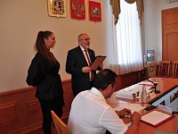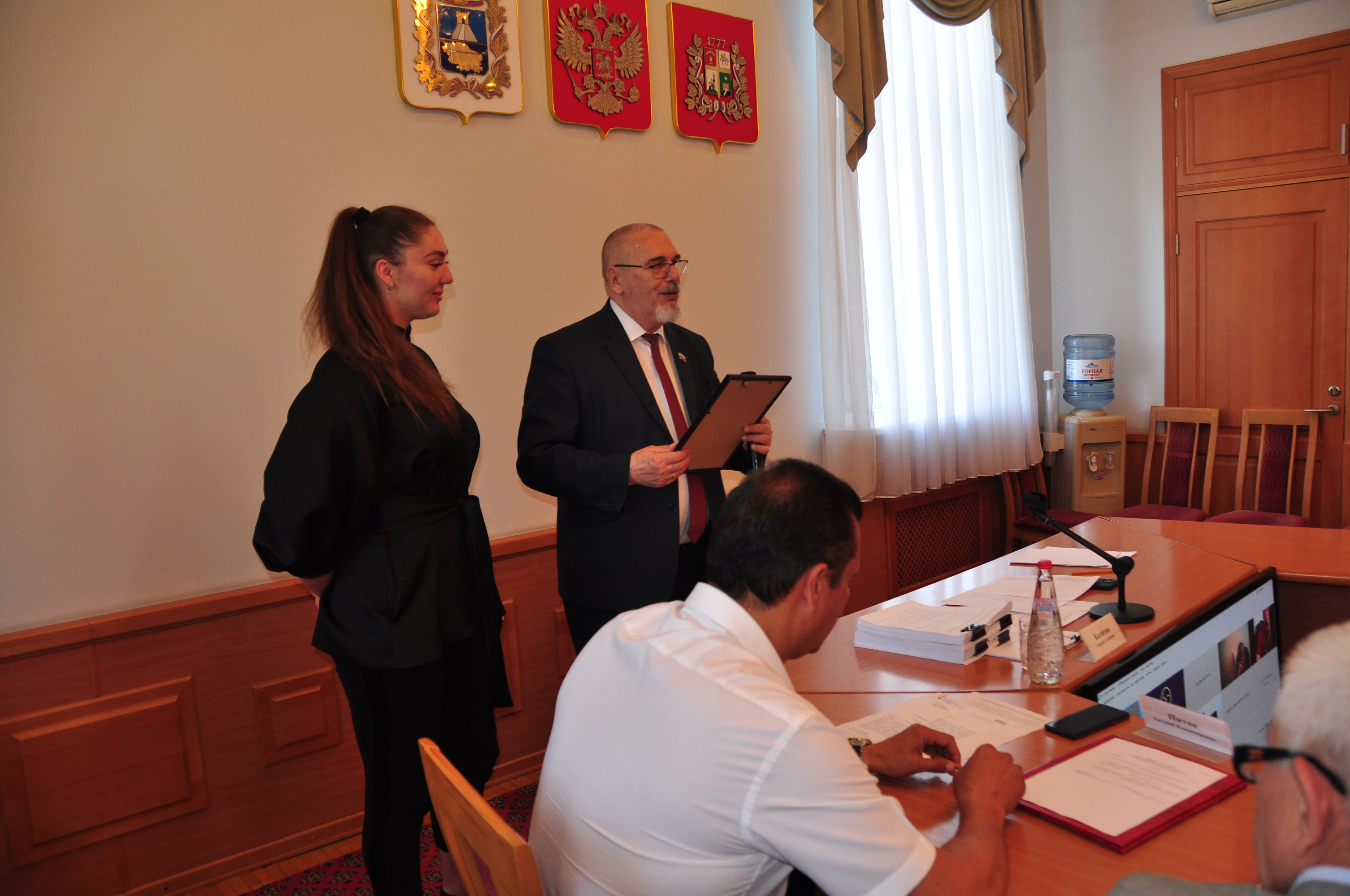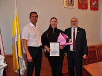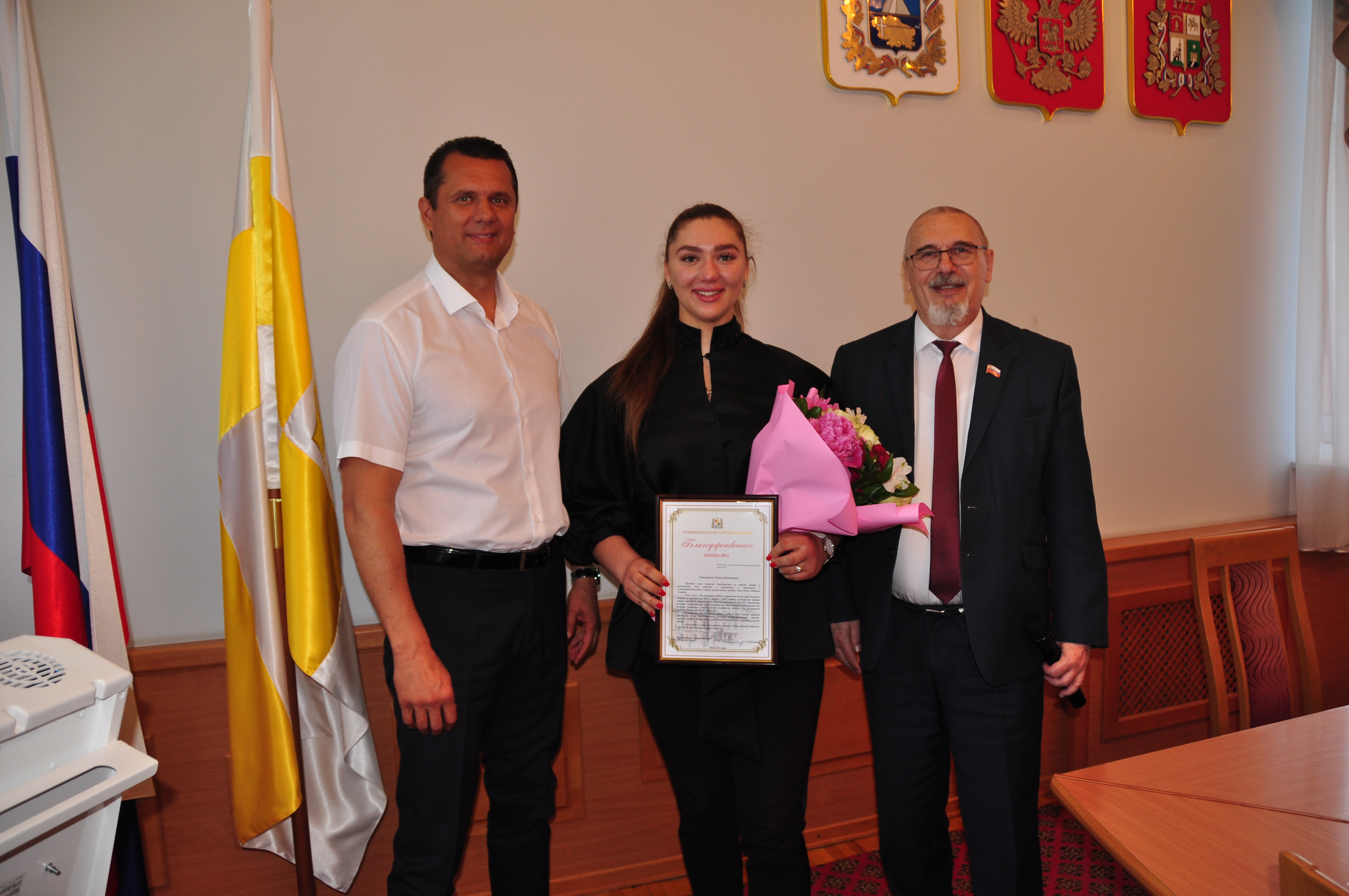 Георгий Колягин открыл заседание приятной и почетной миссией: вручил благодарственное письмо Ставропольской городской Думы Диане Пятак. Эта талантливая и яркая девушка, кандидат в мастера спорта по рукопашному бою недавно стала обладательницей двух «золотых» наград - первенства России и Кубка страны, посвященного памяти первого президента Всероссийской федерации рукопашного боя В.И. Харитонова. Впереди у спортсменки – новые старты, теперь уже планетарного масштаба. Спикер Думы пожелал Диане дальнейших успехов, чтобы на состязаниях самого высокого уровня она всегда достойно представляла родной город Ставрополь.