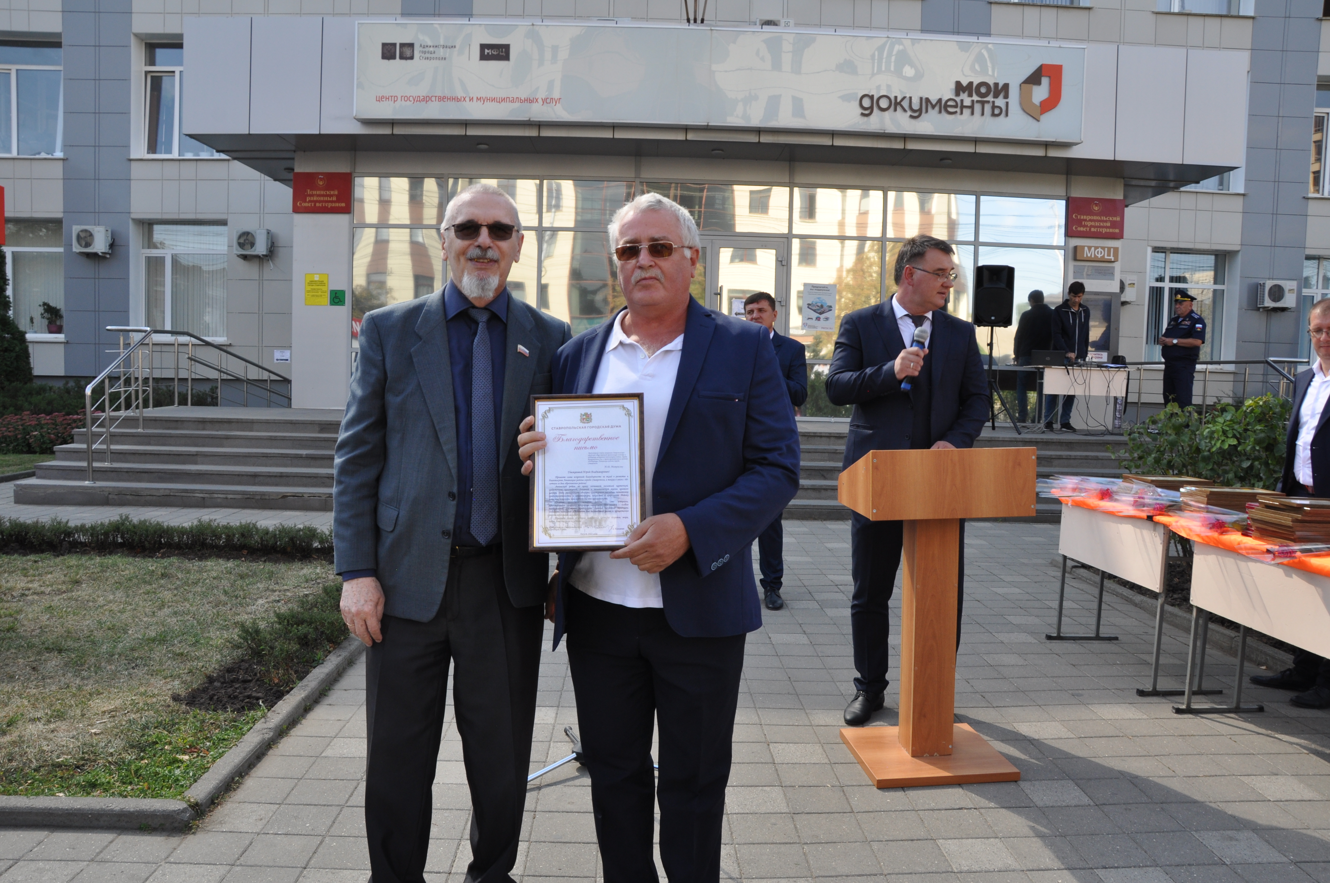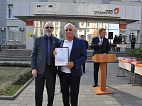 Георгий Колягин вручил благодарственное письмо председателю Совета ветеранов Ставропольской городской общественной организации помощи и поддержки ветеранов (пенсионеров) войны, труда, Вооруженных Сил и правоохранительных органов «Поддержка» Ленинского района города Ставрополя Юрию Митрясову.