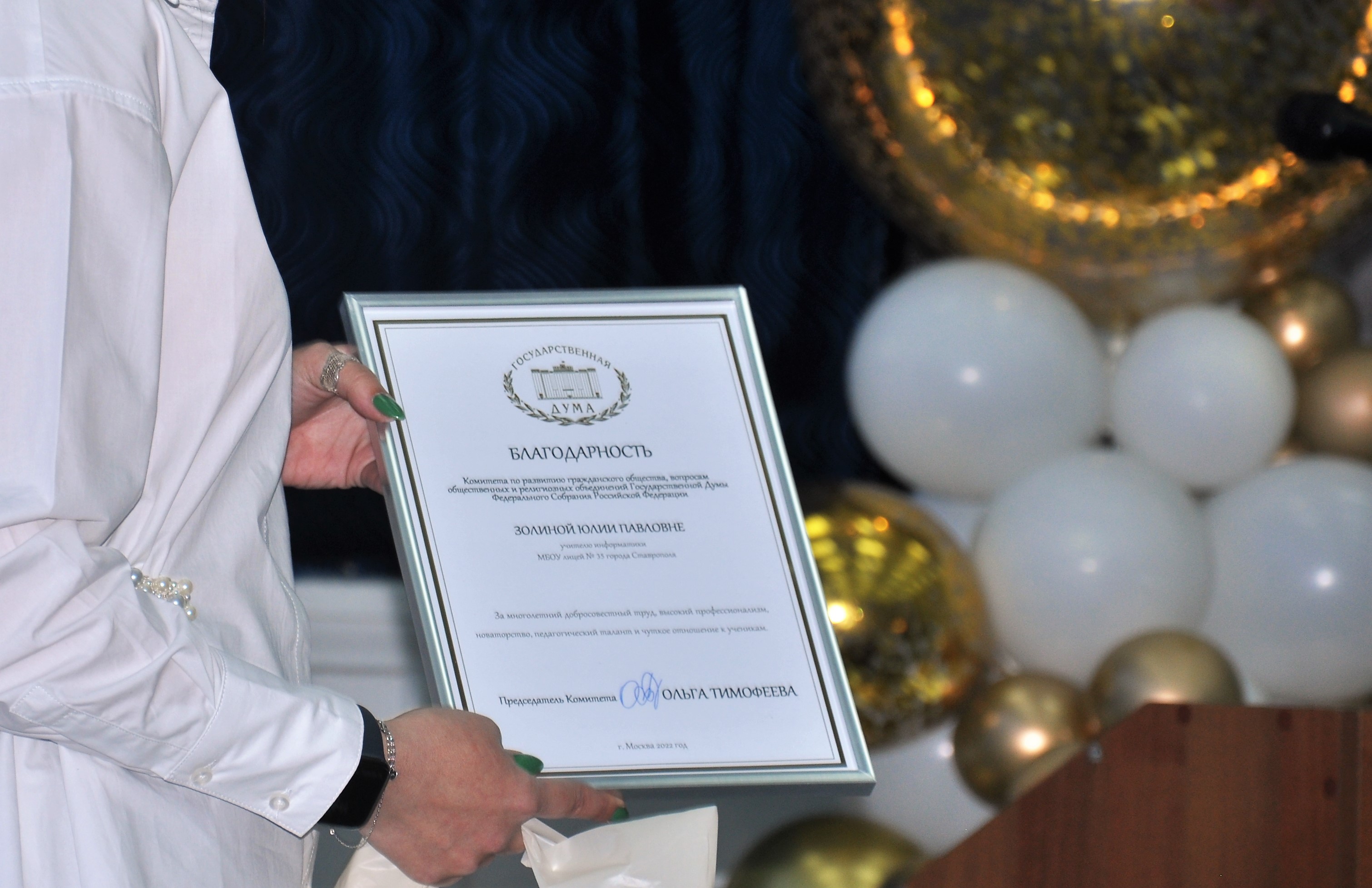 Главных творцов лицея – педагогов, ведомых харизматичным руководителем Натальей Симоновой, поздравляли ученики и выпускники, коллеги по учительскому цеху из других школ, депутаты городского парламента, представители общественных организаций и главреды ставропольских газет. Отличники профессии получили заслуженные награды: опытные педагоги были отмечены почетными грамотами и благодарственными письмами различных ведомств.