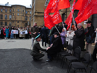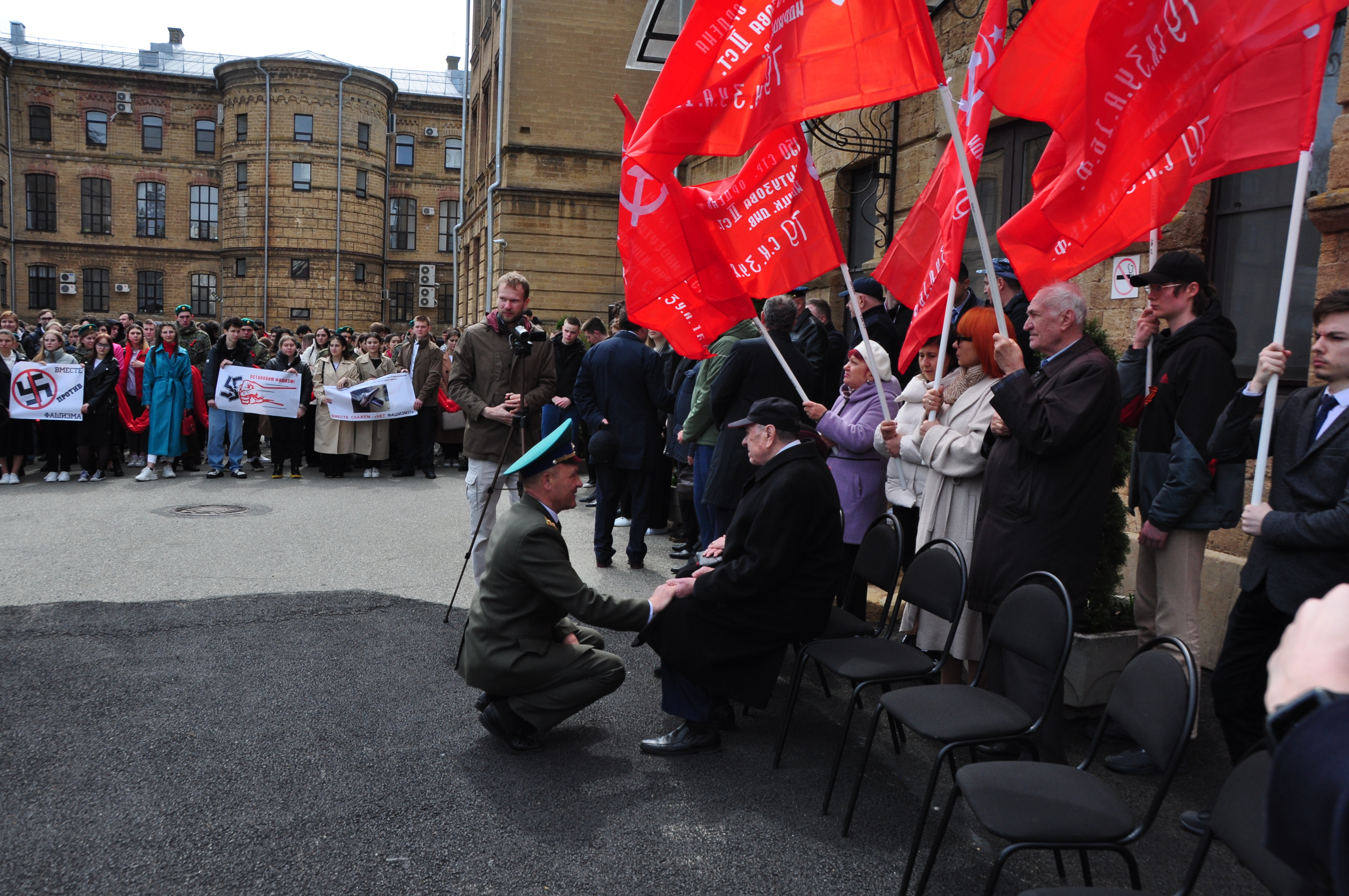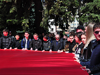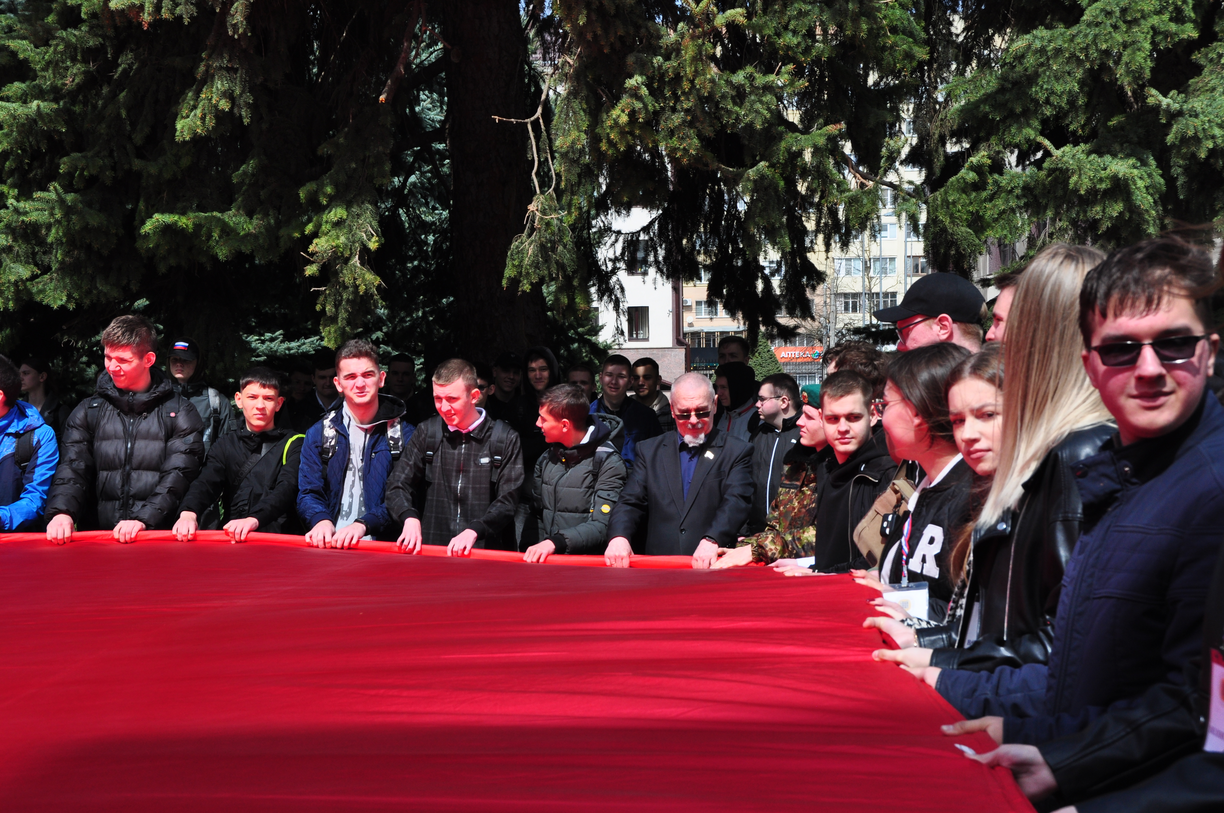 Краевые парламентарии, ветеранский актив краевой столицы, общественные деятели, студенты и преподаватели развернули перед стартом всероссийской акции самое большое в мире Знамя Победы. Его площадь – полторы тысячи квадратных метров. Как отметил координатор проекта, кавалер ордена «Мужества», подполковник погранвойск ФСБ РФ Виктор Лозовой, алое знамя Победы символизирует миллионы капель крови, за каждой из которых - жизни, отданные на фронте, в тылу, в блокадном Ленинграде, в концлагерях…