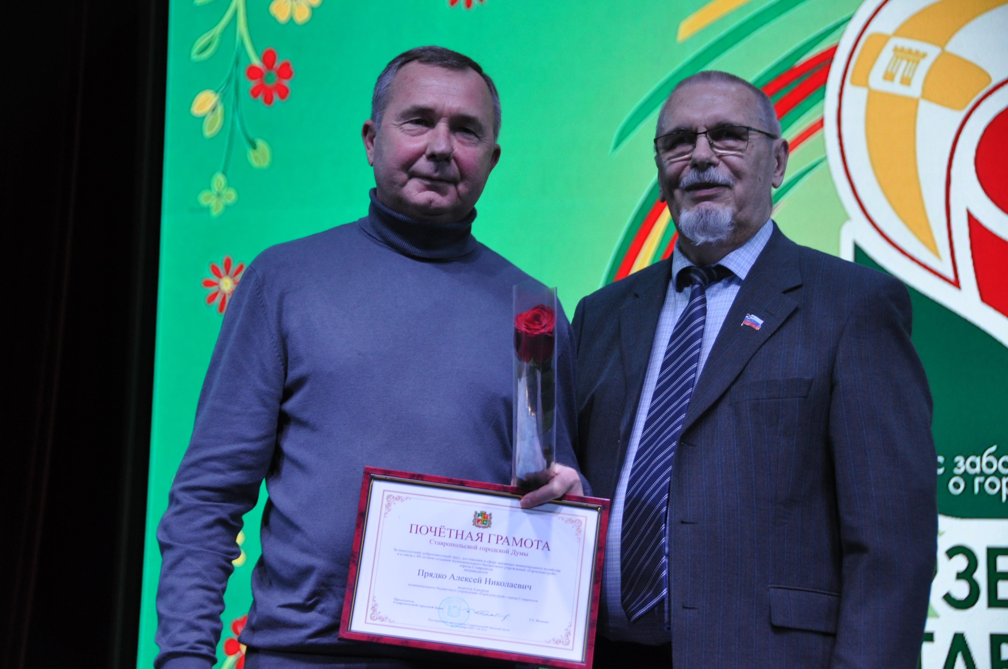 Кульминацией поздравлений спикера стал торжественный момент награждения медалью Ставропольской городской Думы «За заслуги перед городским сообществом» директора «Горзеленстроя» Галины Волыченко, которая по совместительству является также депутатом городского парламента. Георгий Колягин поделился: «На последнем заседании Думы депутатами единогласно было принято решение о награждении директора «Горзеленстроя» Галины Владимровны. Эта ведомственная медаль вручается за особый вклад в развитие Ставрополя, значимые результаты и выдающуюся профессиональную деятельность, и Вы объединяете все эти характеристики в себе», – сказал председатель Думы.