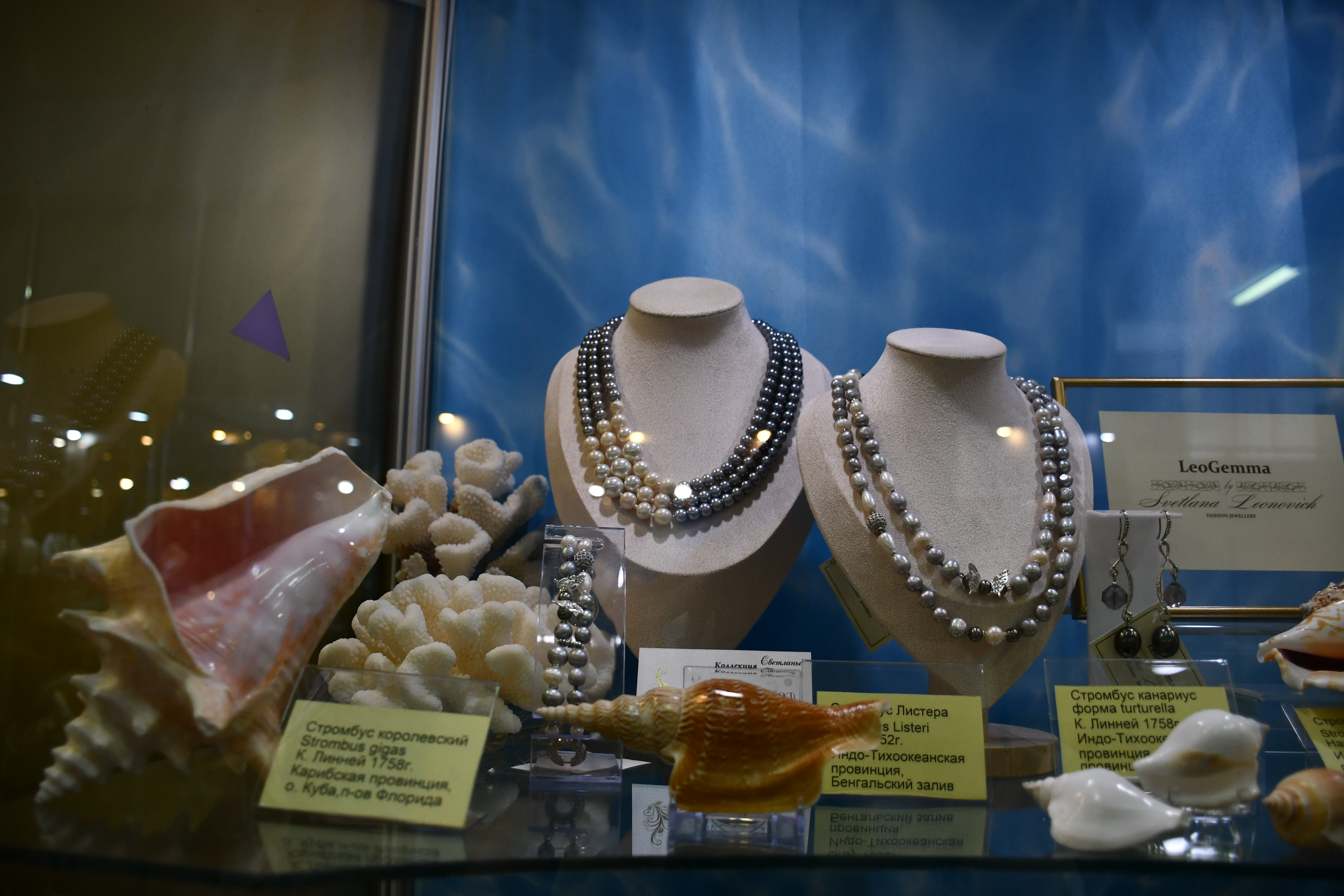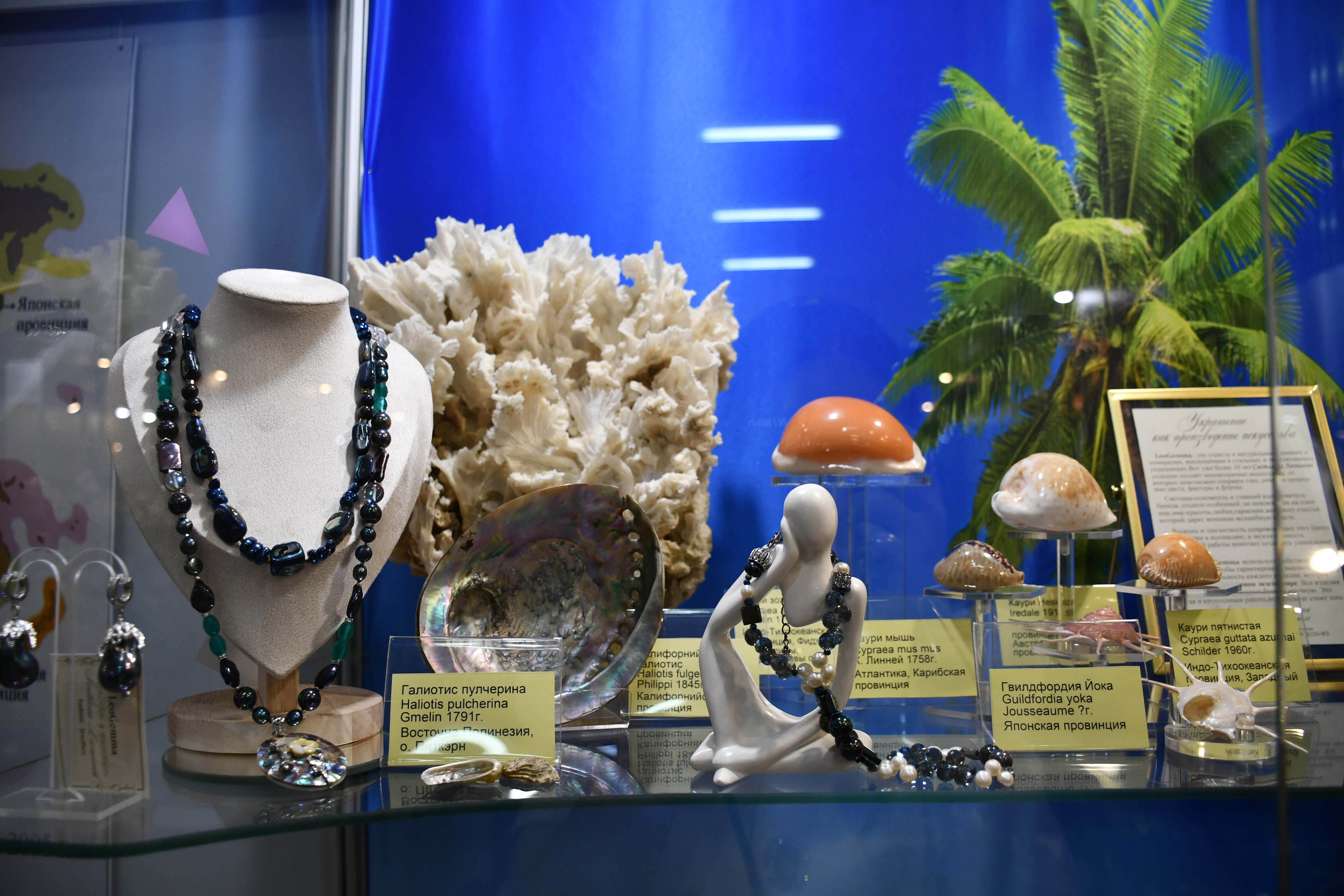 На выставке представлены оригинальные авторские украшения из коллекции «Литораль», а также уникальное собрание конхиологических редкостей, насчитывающее около 500 экземпляров. Это раковины моллюсков, кораллы-акропоры, природные окаменелости и конкреции провинций Мирового океана. Среди уникальных образцов собрания – золотая каури, настоящая жемчужница, североавстралийский трубач и многие другие редкие экземпляры.