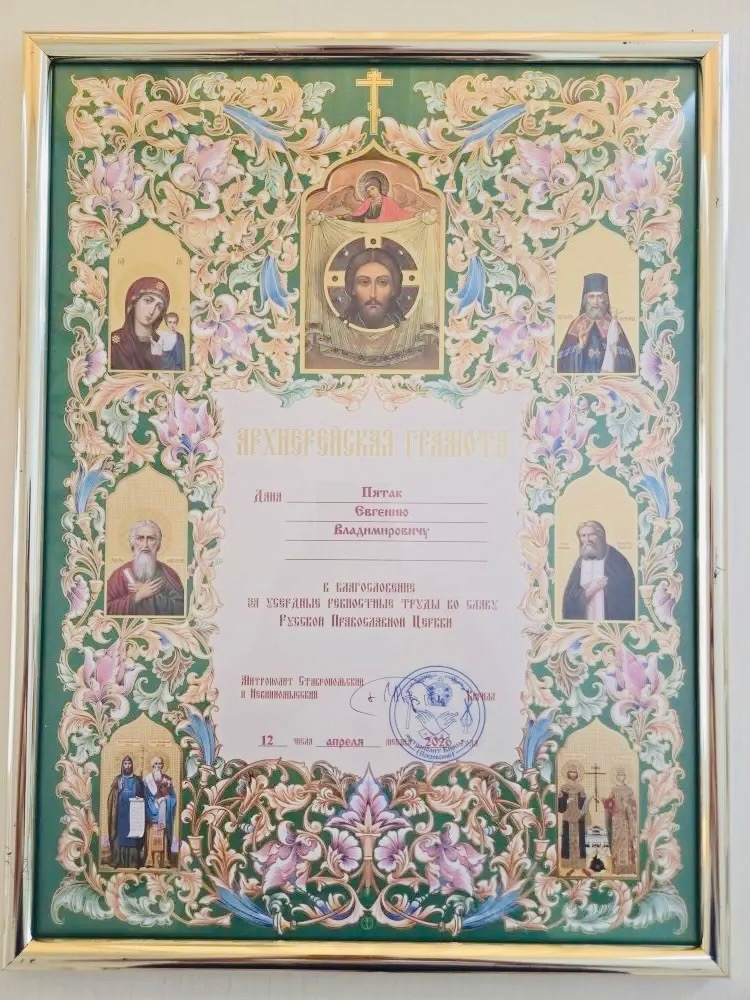 Первый заместитель председателя Ставропольской городской Думы Евгений Пятак удостоен архиерейской грамоты