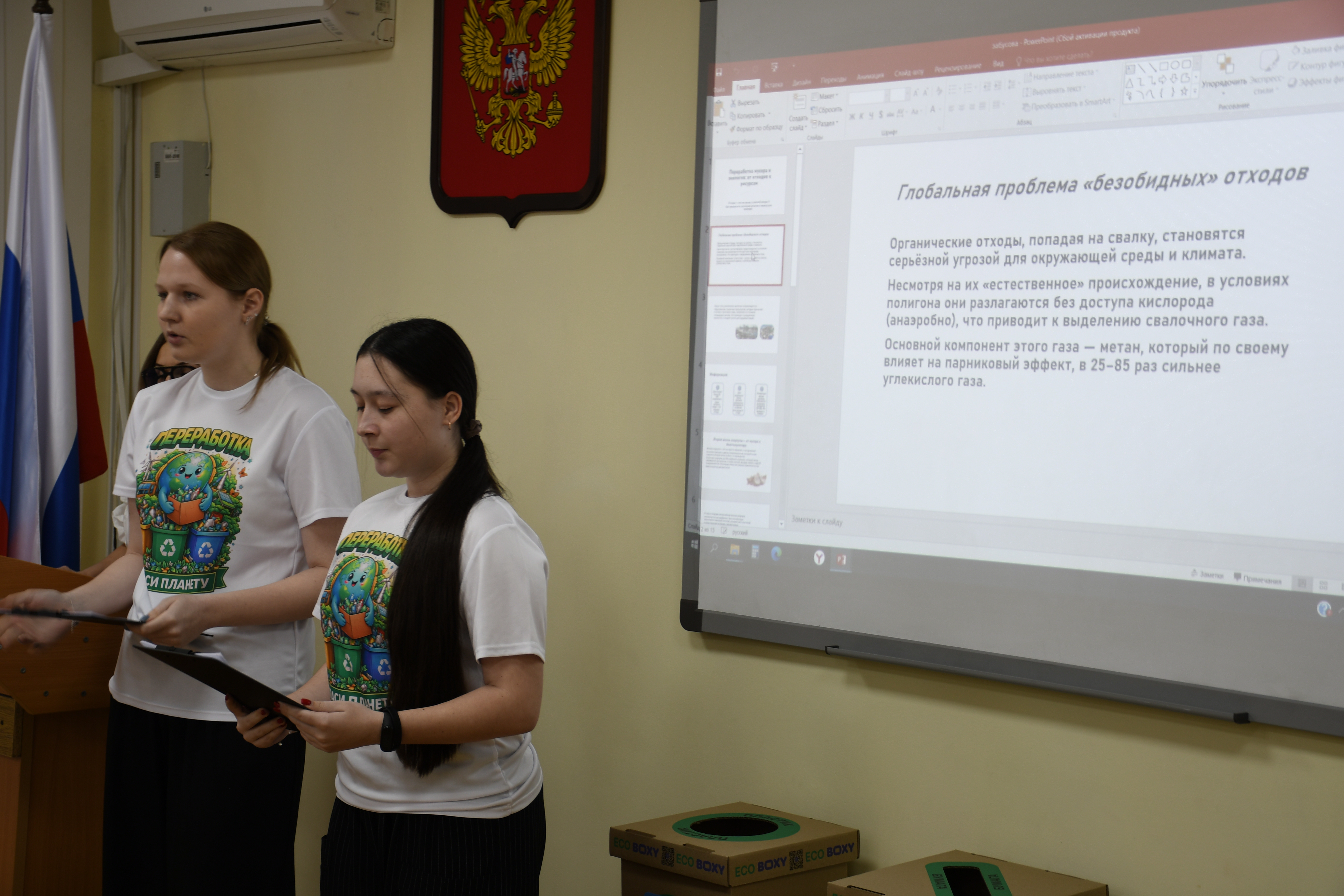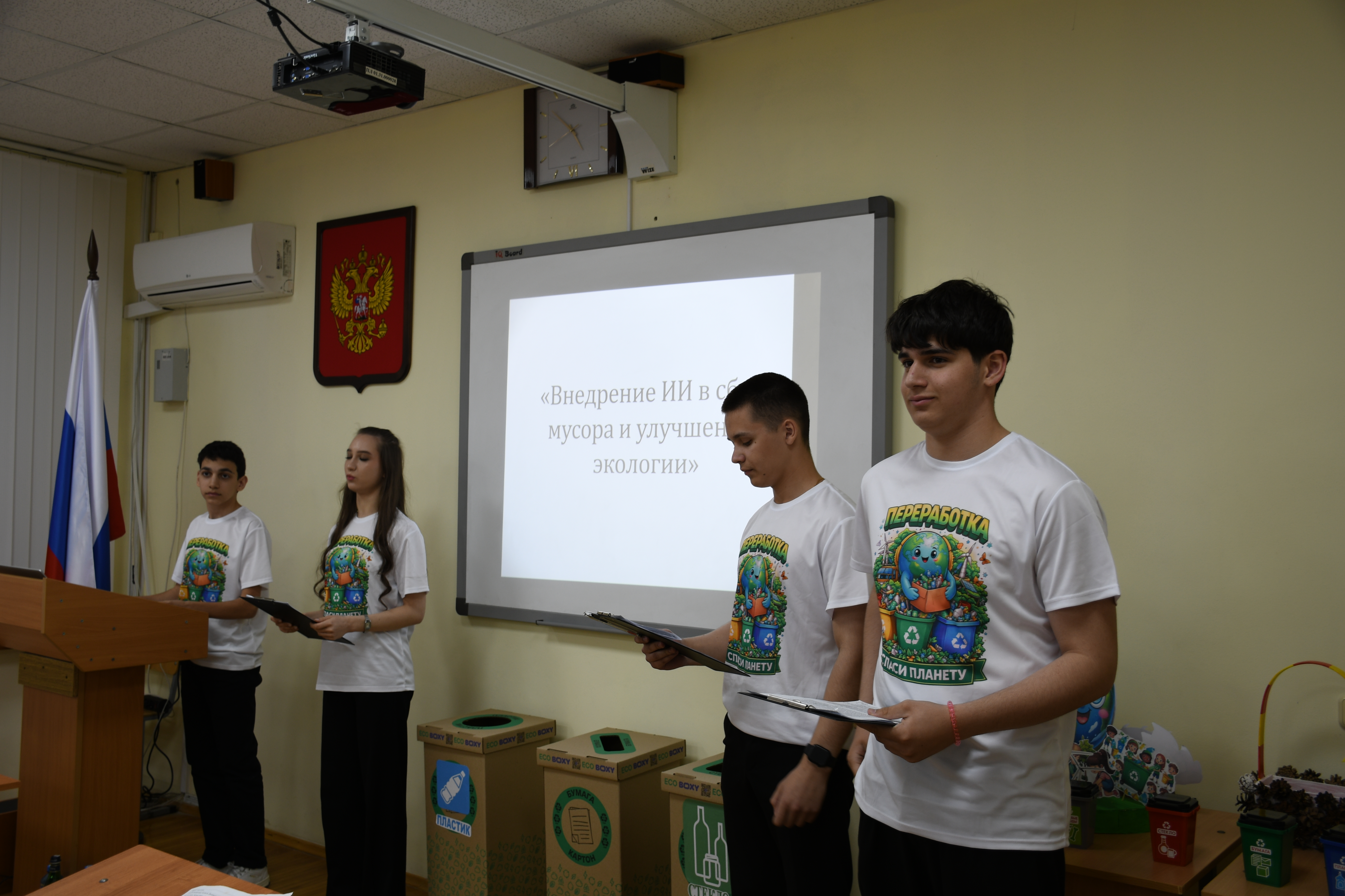 Кульминацией занятия стала практическая часть – защита семи проектов, подготовленных десятиклассниками, по теме правильного обращения с бытовыми отходами. В своих работах ребята предлагали самые смелые и современные решения: от создания приложения с системой бонусов до внедрения искусственного интеллекта в мусорную логистику. Многие из них уже закрепили свои экологические привычки на деле – в рамках класса ребята установили три урны для раздельного сбора пластика, бумаги и стекла.